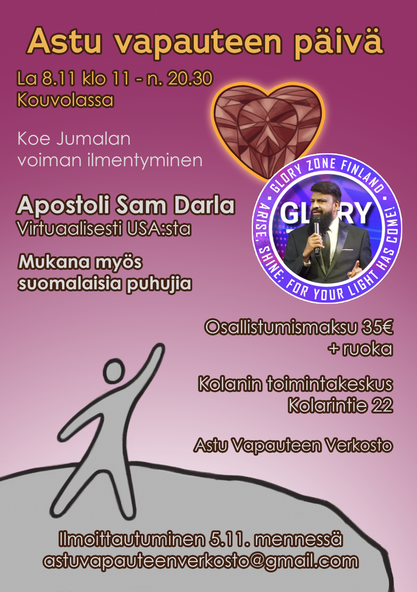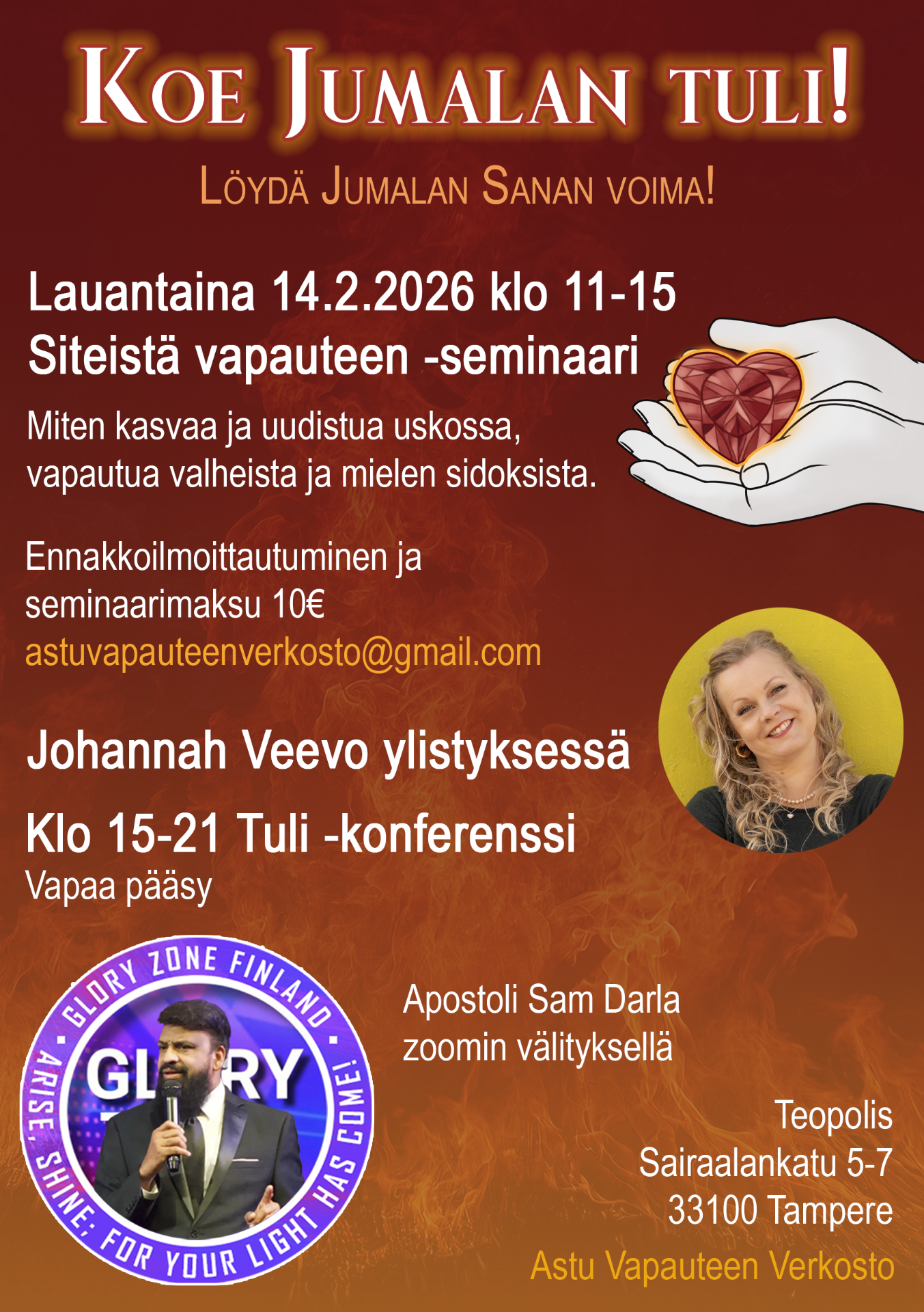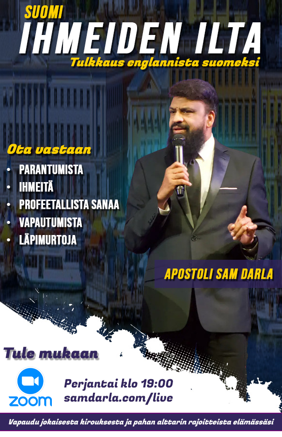 Apostoli Sam Darla, King Jesus Faith Centeristä Ohiosta, vierailee Suomessa ja Virossa. Nyt sinulla on ainutlaatuinen mahdollisuus tulla näkemään ja kohtaamaan Jumalan parantavaa voimaa avoimissa Parantumisen Virta -illoissa!